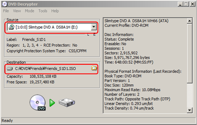 4. Source に DVD の入った DVDドライブが設定されているか確認し、Destination には ISO ファイルを保存したい場所とファイル名を指定します。Source を変更するには、メニューバー左端の File > Browse から、 Destination を変更するには ISOファイル名の右横にあるフォルダーマークをクリックして指定して下さい。
